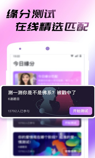 伴缘可以帮助用户快速匹配自己感兴趣的人,在这里你可以找到志同道合的朋友进行聊天交友,同时还能认识许多的单身人士来这里一起约会玩耍,软件功能十分强大且简单易上手。