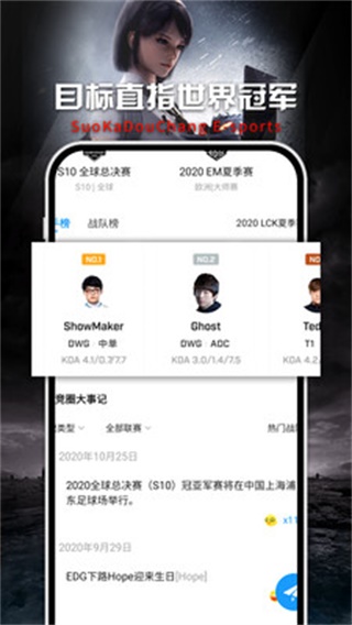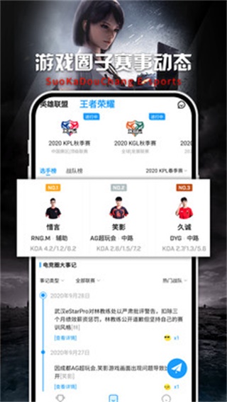 梭咖斗场电竞是款专业的电竞赛事资讯信息查询平台,这里有各种各样的电竞比赛和赛况。我们可以快速进行查看并了解。软件功能全面丰富适合喜欢看游戏的朋友们前来下载体验吧
