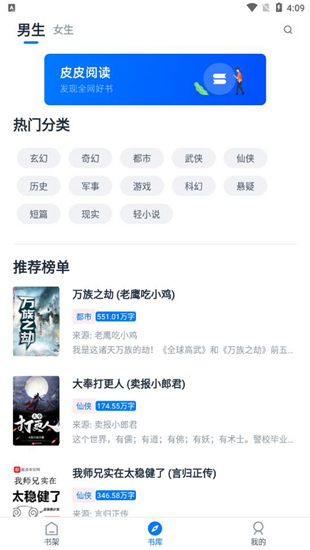 皮皮阅读是一款小说追书的app,在皮皮阅读这里有着海量的小说资源等你来搜索哦,让你随时随地都能看自己喜欢的小说内容!同时皮皮阅读还提供个性化推荐功能,为你量身打造一个最合适的阅读体验,喜欢这款软件的用户快到绿色资源网下载体验吧。