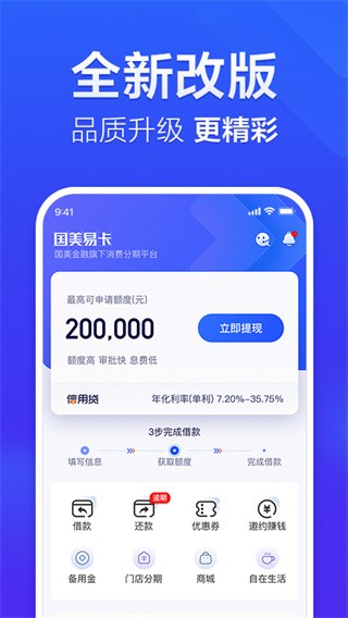 国美易卡app是国美的官方推出的一款手机消费分期软件,软件拥有非常多的功能板块可以使用,为用户提供一站式贷款、借贷服务等功能。目前软件支持信用卡办理、现金借款、分期还款等等金融产品体验操作方式以及智能匹配方案推荐给你选择合适的产品进行下单购买了。此外在国的美易卡app上申请额度最高可达10万元,并且平台还会不定时发放各种福利红包和现金奖励哦!喜欢这款软件的用户赶紧来本站下载使用吧。