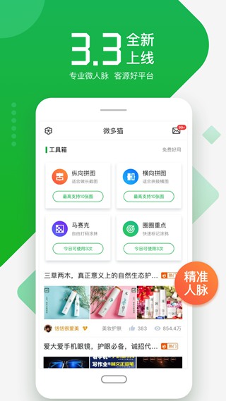 微多猫是专为广大微商用户提供一个非常好用的推广工具,在这里你可以通过它将自己的广告快速的转发到你的朋友圈里进行营销和管理;通过这款软件可以让微商能够更加轻松地获得客源信息、客户资源与潜在客户之间的联系关系以及提高销售转化率,让你在短时间内就能获取到客户的信息并跟进。