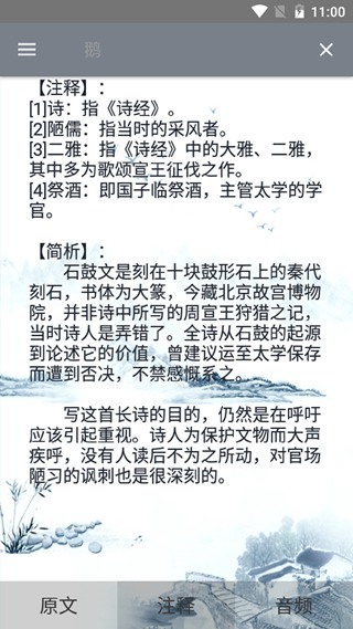 每个诗词均配有真人发音,对照注释进行朗诵记忆。