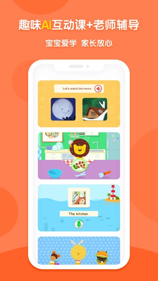 【全新界面】全新UI设计,更加简洁方便; 2、【海量内容】精选欧美专业英语外教,搭配纯正发音,日常口语交流; 3、【进阶课程】根据学习情况定制专属成长课程,针对性地提升; 4、【分级阅读】原创插画和故事化闯关解锁新概念英语,培养孩子的创造力与想象力; 5、【互动游戏】通过互动式游戏引导孩子完成学习任务,激发兴趣; 6、【沉浸体验】全英文环境模拟真实生活场景,让宝宝主动参与学习; 7、【贴心功能】录播视频反复看、收藏课件下载,家长可轻松查看课堂信息; 【科学分类】按年龄段收纳课程,便捷查找所需资料。