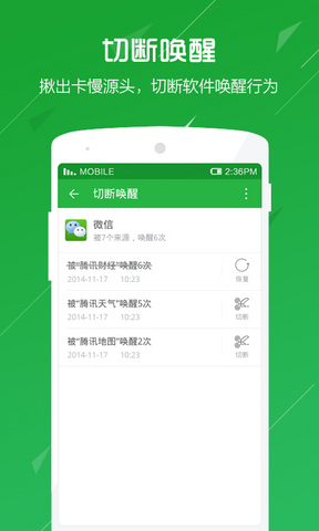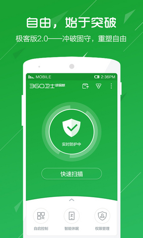 360卫士极客版就是360手机加速大师精简版,这是专为安卓用户设计的一款手机优化工具。使用该工具可以让您彻底清理系统缓存、释放更多储存空间,提高手机运行速度,并快速解决卡顿、掉线等问题。同时360卫健精致简约的界面也给人一种清爽的感觉,而且操作简单,没有任何广告和推送信息,并且内存占用极小,不会影响到用户的正常使用。除此之外,软件还支持一键扫描出所有病毒以及漏洞文件,还可以深度查杀病毒,对恶意病毒进行扫描,帮助用户及时防护手机安全。