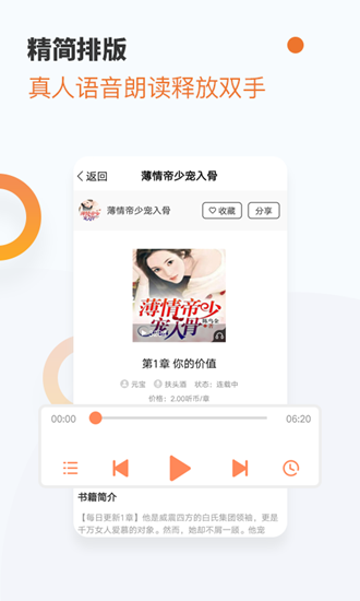 你可以快速获取更多热门的作品详情以及评论等详细的信息供你了解查看到相关动态资讯服务平台使用更加方便简单便捷式管理操作系统设置选择更容易上手浏览体验极佳聆听到各类精彩文章故事带给你全新优质享受模式开启全新的高品质音频生活感受感十足尽享自由自在播放超多丰富多彩声音世界任意添加收藏喜欢的声音频道一键关注作者实时更新最新动态不错过任何精彩章节节目上线及时把握最新的精彩情节热点追书全站所有图书统统免费下载不花一分钱就可让你在手机上就可以更好的完成大量文学经典与各种小说创作者们的交流互动分享乐趣无限发现众多精品好书源任您倾听正版出版专区还可根据自己的喜好来定制属于您的专属个性化智能语音朗读之旅即刻开始吧!