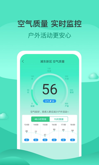 可定位当前位置,自动显示周边地区的天气预报与空气污染情况。