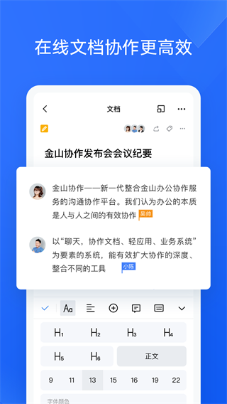 wpsword远程协作app,金山文档云同步服务平台,支持手机端、网页端以及PC端等多端数据互通共享使用;提供多种高效沟通方式及团队成员之间的即时通讯解决方案。