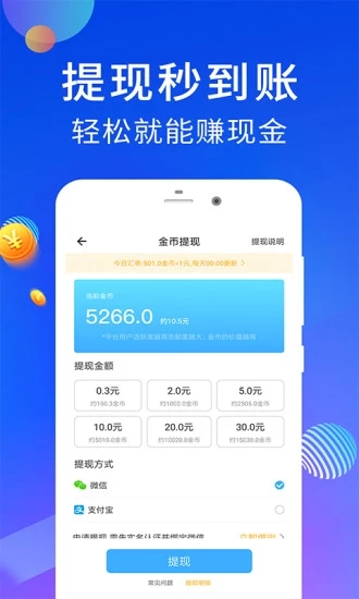 2、提现秒到账:一键快速申请提现成金额,实现无门槛免费提取金币。