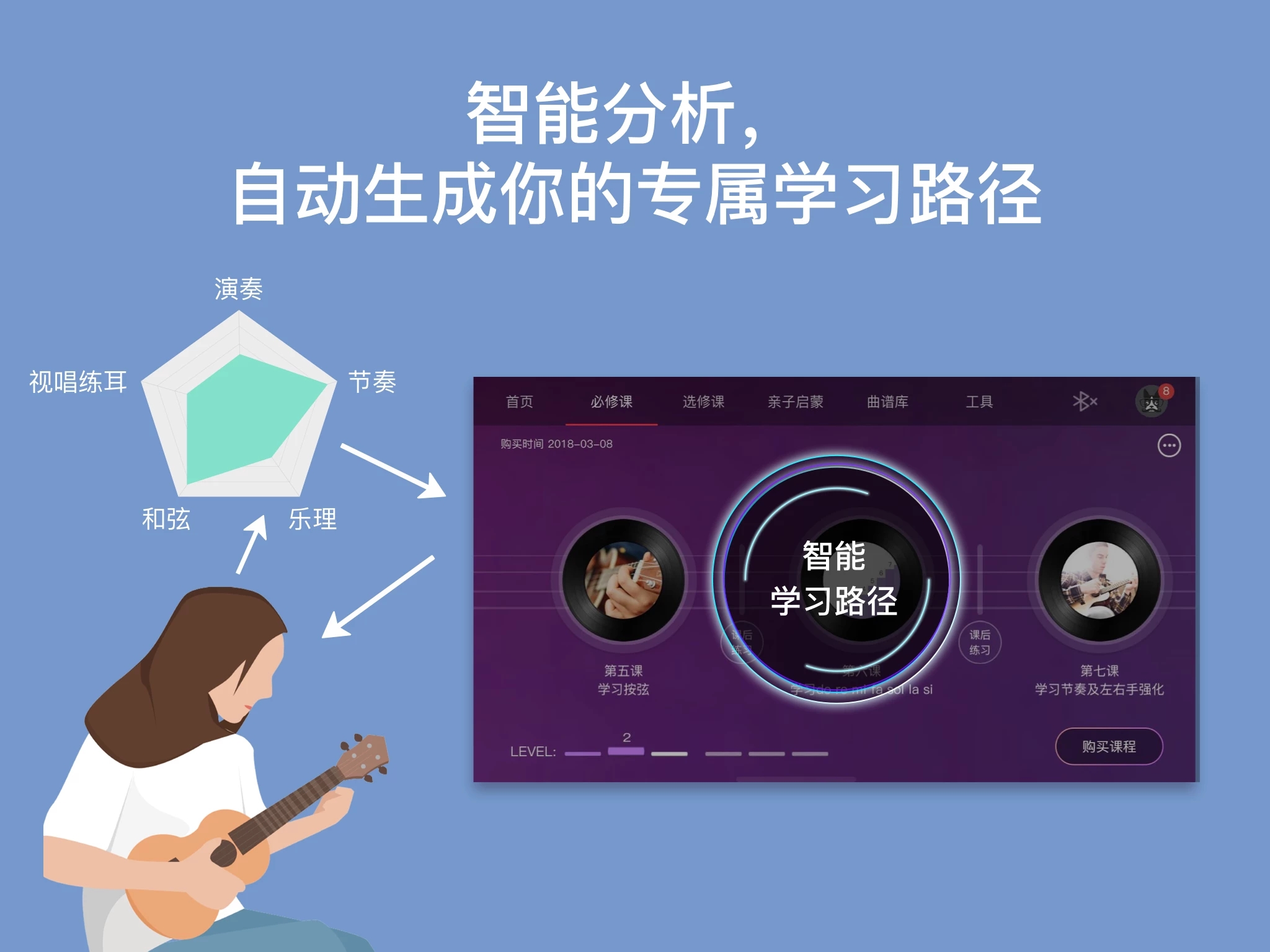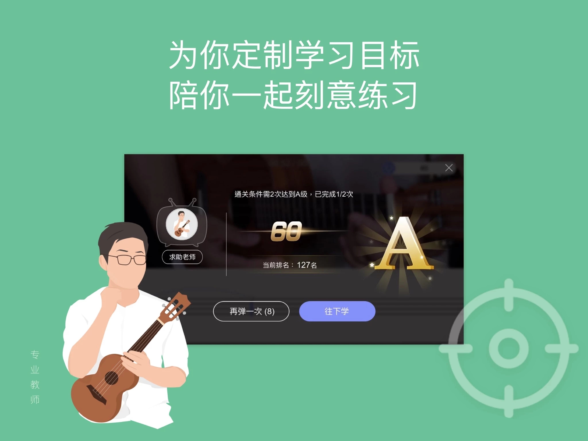 帮你了解自身的学习状况和进步情况,针对性的提升提高你的吉他演奏技巧和音乐素养。