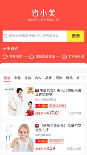 省小美可保护是一款为购物者们提供的商品购买服务应用工具,这款软件里面拥有超多的商品类型供你选择购,而且价格也是十分的实惠,让你随时随地都能轻松下单、一键搜券等等操作简单方便好用,是广大用户们的网购必备神器,喜欢网购的用户朋友们一定不能错过哦!