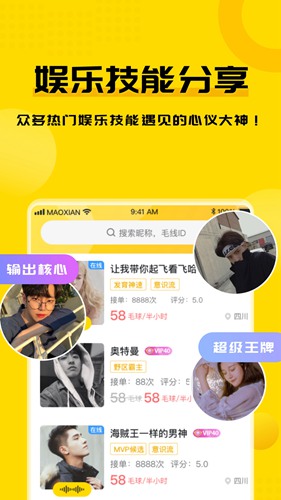 毛线app是款非常热门的游戏陪玩软件,在这里你可以轻松找到各种大神带你上分,这里还有很多语音交友活动等着你参与。同时在app内我们还能查看到自己附近的人信息和玩家们一起聊天互动,喜欢的朋友不妨速速下载体验吧!