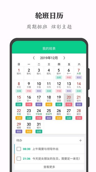 界面美观简洁:界面设计精美的轮班日历应用程序采用了简单的拖放式设计,适合各种年龄段的用户的使用。