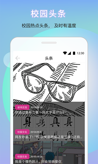 第一时间获取最新校园资讯,及时掌握校园动态,关注社团最新活动通知,更有校园活动直播预告片让师生提前知晓校园风光;