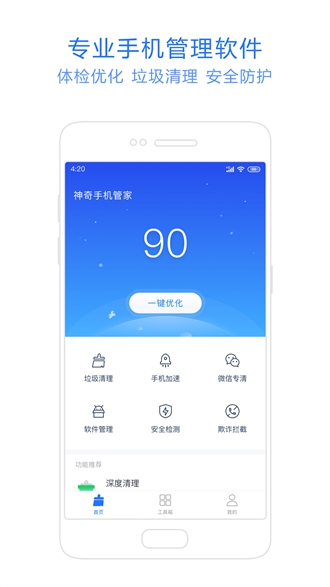 神奇手机管家是一个专门为安卓手机设计的手机优化和清理软件,通过它你可以快速地对安卓系统进行全面体检并清除垃圾文件,让手机运行更加流畅,同时还能够帮助你管理应用程序。