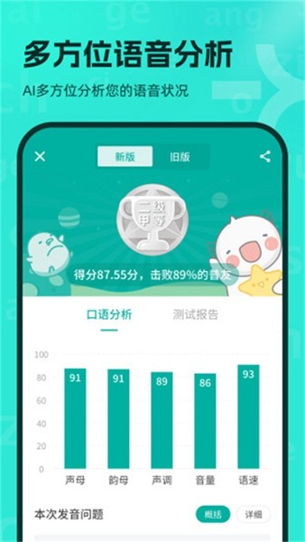1、【全真题库】全真题库涵盖了国家通用普通话等级考试所有题型(含单选/多个选题)、历年常错题,根据用户的普通话测试情况生成相对应的“综合评分”。其中包含“单项选择”“多项选择”四个类别,分别有拼音声调字母表、韵流、声调字母表、儿化生字词等多个维度,并且还可自由切换题目类型。
