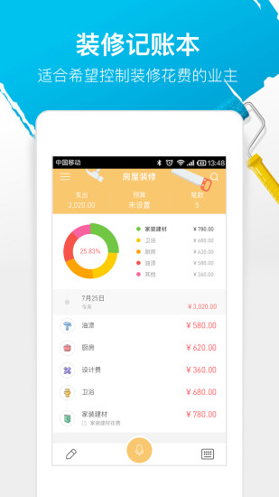装修公司全面覆盖各大行业,从此告别“被坑”、“不知道怎么选”、“如何花钱买房子”,装修记账本就是你的装修管家的app。