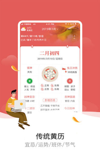 天象黄历app是一个功能强大的日历软件,在这款天象黄历app中用户可以了解到详细的日期信息哦,而且天象吉神app上还有很多的天气预报服务等你来体验,感兴趣的用户快来下载吧。