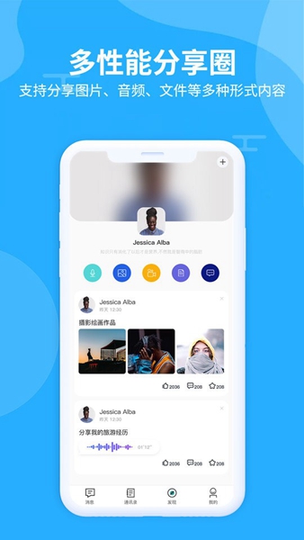 实时在线文字、语音沟通,支持文字分享图片及视频;