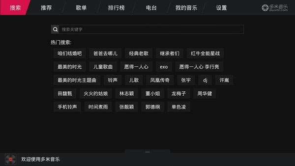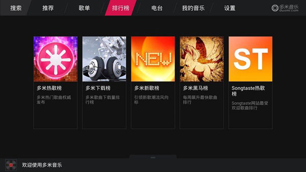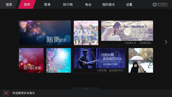 多米音乐电视版是一个很棒的手机音乐播放软件,可以安装在智能电视上。在这里你可以找到各种不同的歌曲资源哦。并且这里还有很多的热门榜单让你看不停。如果你也想听音乐也可以直接搜索到自己喜欢的歌曲类型!欢迎下载体验。