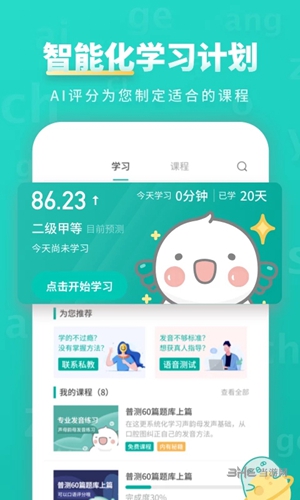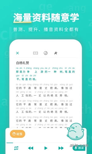普通话学习app是一款专业的普通话测试软件,专为想要考普通话、考幼师、播音主持、配音员等的人群设计。软件采用人工智能技术对你的普通话水平进行评分并生成相应的发音表单供参考使用。
