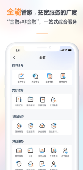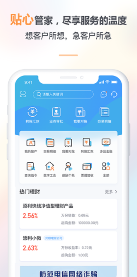 3、【灵活运用】兴财管家企业版APP集成了银行业务办理的功能,您可以在这里享受到各种实用工具,包括贷款计算器、账户余额充值、代发快递等等,满足您的多元化使用需求。