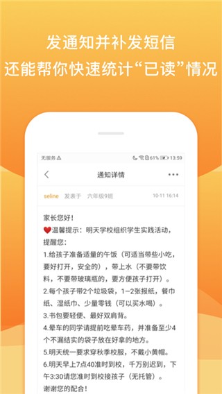 支持发送图片/语音/文本等多类型的消息推送至家长手机桌面或者短信中,还可选择是否允许接收来自家长的最新消息提醒。
