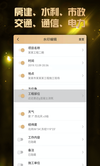 提供给施工人员使用的一款相机应用。可以帮助用户快速定位自己所在的城市或位置,让建筑工人在任何位置都可以准确地获取所在地的经纬度、天气、地理位置信息并将其保存于手机里。