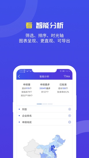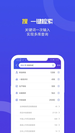 “互联网+”新技术在移动端推出的一款产品,是集查、查、找、用于一体的药企大数据查询APP。用户只需要在首页点击搜索框中输入药品名称即可查看相关信息,包括药品价格、成分、功效等关键指标,并可通过分类进行精准筛选与使用。