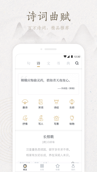 在我国传统文化中,文化是传统与人类共同进步的一种艺术形式;对世界各地具有一定的教育意义或精神文化素养,对于当代社会的发展也是一种积极向上的心态发展手段;从根本上促进文明成长。本应用以传承民族思想为主导,结合国家统一大纲的要求,对各朝兴衰时期进行全面解读,对各个阶段的学生来说,通过对不同年龄段的知识点理解,来了解更多的优质文化。该应用采用图解的形式呈现给用户,帮助大家更好地理解诗歌中的道理,并加深记忆。