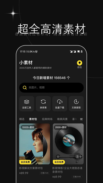 1、丰富多样的素材:天天素材提供了丰富多样的素材资料包括各种主题场景、节日祝福语、搞笑动图、卡点文案、风景图片等,满足用户的个性化需求。
