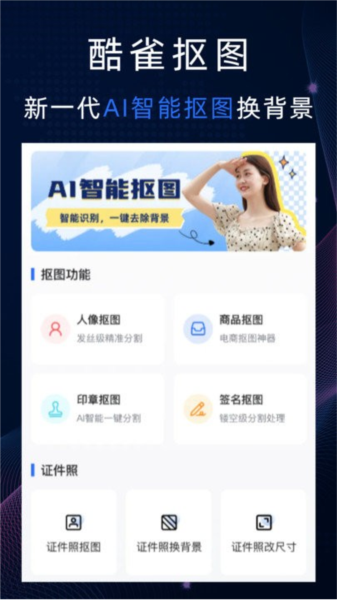 酷雀AI智能抠图让你手机上也能完成抠图的编辑,可以导入自己想要处理的图片。在线拥有很多滤镜和特效素材,你可以自由选择使用进行剪辑了,同时这里也为大家准备了很多模板哦,你也可以直接用模板来制作证件照等操作。欢迎有需要的朋友下载使用!