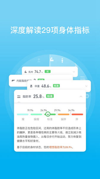 多项身体指标监测:包括血压、水分、蛋白质和BMI指数等,帮助用户更好地了解自己健康情况。