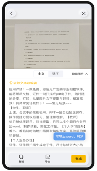 “我”模块拥有丰富的编辑功能,您只需轻触几下便可修改文本大小、颜色、位置等属性,甚至还能选择导出pdf、jpg等多种常见的格式输出为PDF/JPG格式。