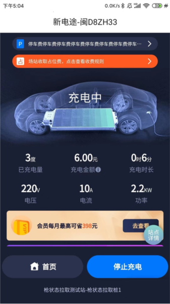 1、【首页】显示附近的充电站点动态内容更新状态栏目中的优惠政策公告通知消息等等,