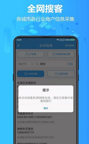 精准搜索:全网客源覆盖全国各大城市地区,实时对接最新客源企业、市场线索及联系电话,可自由切换采集区域,实现自动采集或手动采集的功能。