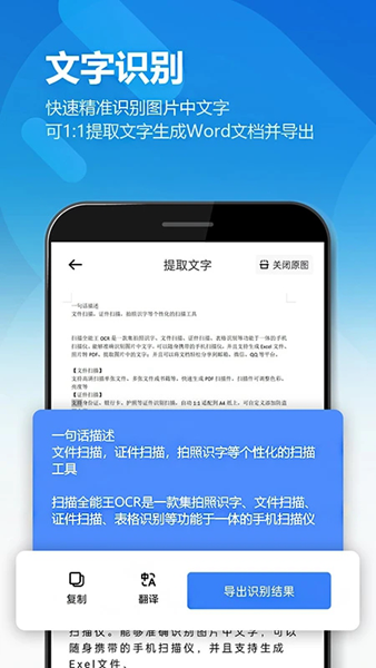 图片扫描全能王app是一个非常强大的手机图像识别软件。支持拍照、文字提取,可以将图片中的文字快速翻译为对应的文本内容!本软件操作简单易上手,是您日常生活中不可多得的必备工具!快来下载使用吧。