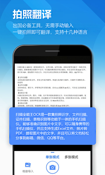扫描王图片识别可以方便的文字转换器,支持多种语言进行翻译功能。软件中有着多种工具帮助用户快速提取文档内容以及拍照转文字等操作!并且使用起来非常简单好用!需要的用户赶紧来下载吧!