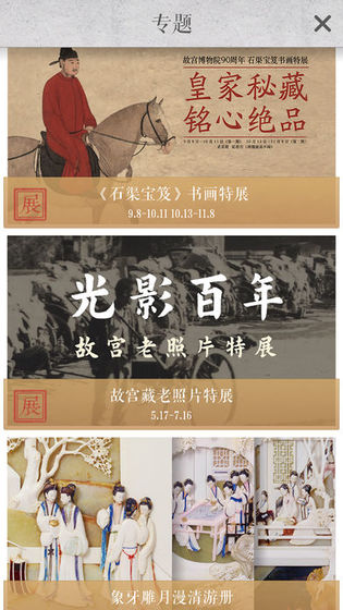 您可在APP里查看各类展览详情:馆藏地址、展览介绍、展览地图、展览预约时间等等。“每日故府”APP还提供了“每日一览”“收藏功能”等多项实用功能,让您的生活更加便捷。