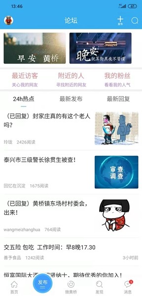 黄桥在线招工黄河本地生活信息服务平台,黄浦本地人都在用的本地社区论坛。在这里你可以看到本地的新闻资讯以及热点头条等内容;同时还能看到本地的各种商家活动可以报名参与哦。线上还可以进行二手交易功能了,让你买到各种各样商品资源。欢迎有需要的朋友下载使用!