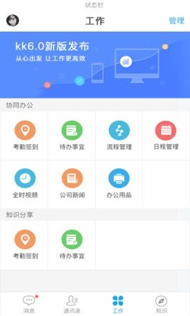 KK7办公系统是专门为企业内部打造的一款手机工作软件,这款软件功能强大且简单易上手,支持各种类型的工作流程使用和管理服务。在KK6办公系统里面用户可以随时了解自己的公司最新动态信息以及最新的员工福利活动等内容!