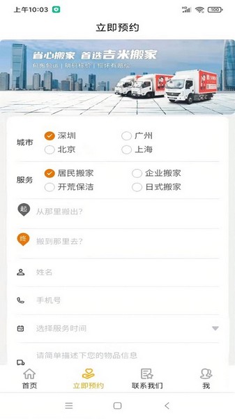 吉米搬家app是专为手机端的用户打造的线上下单购物服务平台,在这里能够快捷进行货物信息的选择。各种商品类型一应俱全方便用户使用体验操作简单便捷实用。需要的用户赶紧看看吧!