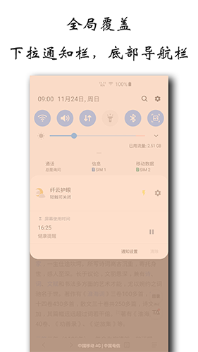 现在的手机上人们对眼睛会有一个很好的认识,但是很多手机都是需要用到的,所以我们平时看手机的时候会发现一些眼睛会受到影响,所以面对一些需要长时间的使用手机的用户们也会造成眼睛的伤害,在面对现在的手机系统上的操作问题上,大家可以看到该应用中所有的功能服务都支持自定义选择自己想要的功能进行调整即可开启自己的护眼模式。
