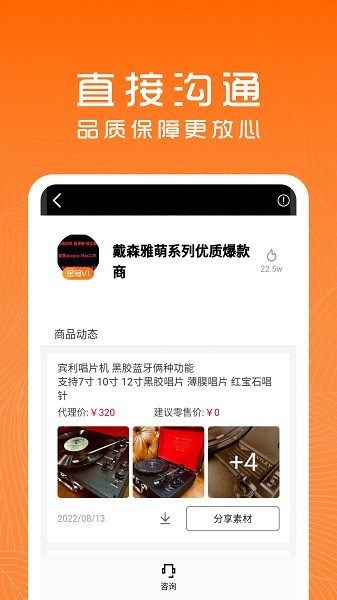 如果您是一位有创业梦想的用户,不妨试试“货源档口”App,它将为您打造一个专属的产品宣传库,吸引更多的客户前来购买。