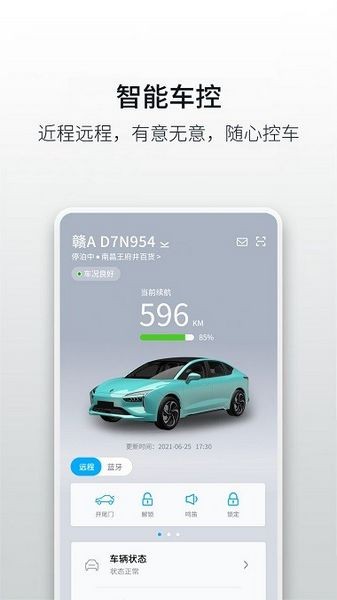 “”是基于大数据和人工智能技术开发的江笛汽车远程控制软件。通过手机APP连接智能车载终端设备后进行远程控件设置操作;对汽车行驶里程、速度等数据实时监控与分析(包括平均公里数)、电量消耗、驾驶行为及安全预警提醒等多维度管理功能,