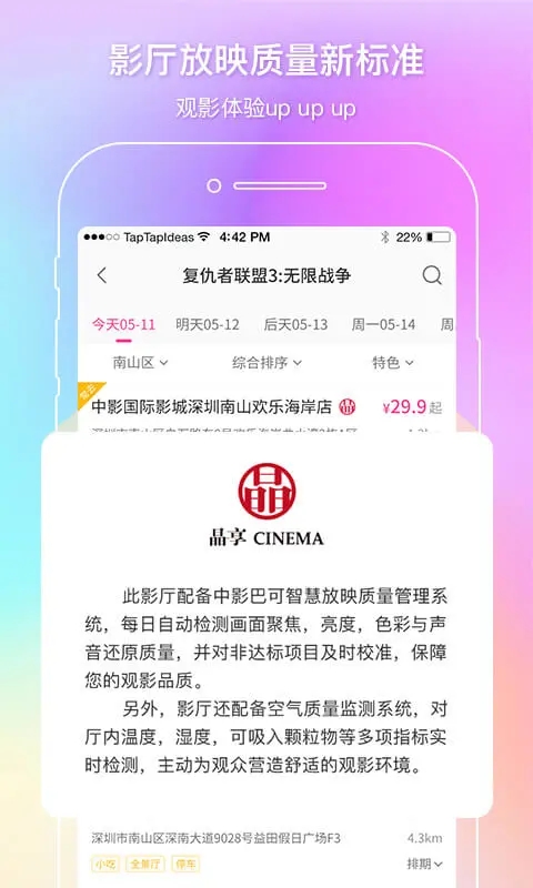 中国电影通是款全新的电影院手机应用软件,在使用的过程中我们可以看到各种电影的详细信息和观看体验。帮助我们快速找到自己想要看的电影类型进行在线观看吧,喜欢的朋友不妨速速下载吧!