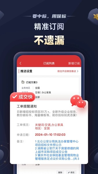2、定制推送速度快:一键关注你喜欢的项目即可获得最新的招标消息通知。