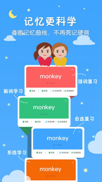 与国内主流英语教材配套使用的学习工具,涵盖小学到高中的所有英语基础词汇记忆技巧,包括发音、例句、对话场景表达、阅读理解等。