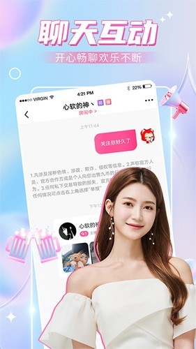【主播】这里汇聚了全国各地的人气明星、帅哥美女,总有一款适合您~•海量的美女主播24小时不间断视频陪伴您的每一天-【颜值】 海量主播:萌妹子、御姐、萝莉......总有一个适合您的风格-【附近】 随时随地发现附近有趣的人-【秀场】 分享生活瞬间,找到你的真爱-【秀场】 实时弹幕聊天互动、唱歌打赏、聊天斗图、游戏PK、相亲约会,精彩互动不停歇~ 【私信】 快速搭讪,畅聊无阻,让缘分不再错过- 高颜女神真人在线撩- 【聊天交友】 即时通话,一键连麦,想怎么聊就怎么玩;【音乐】 海量曲库,轻松愉悦,让你告别单调乏味;【附近】 精准定位,为你推荐身边的TA-【动态】 展示自己,用声音认识更多志同道合的小伙伴;【语音交友】 语音交流,寻找心动的ta~【交朋友】 多人聊天室,和陌生人一起嗨,开启一段甜蜜邂逅。