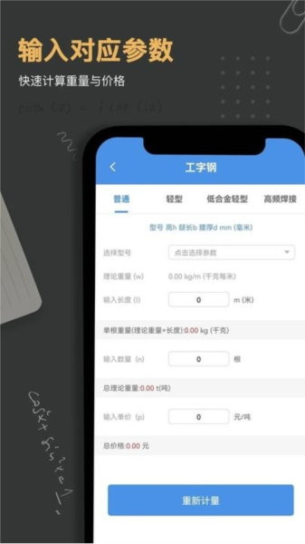“铁重材料”APP是一款专为铜承工匠和机械工人提供钢筋加工数据服务的应用程序。用户只需输入相应的参数即可完成钢料的钢结构计算、钢材加工价格及质量等详细信息记录工作,让您随时随地了解钢架的运输情况,并可通过本应用实时查看钢柜的生产状态,以及钢质变化等重要数据。
