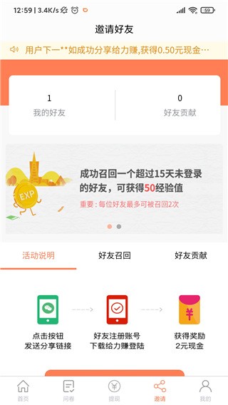 1、邀请好友注册并登录之后就能得到对应积分奖励,只要成功邀请一个用户以后就会获得相应的奖励了;